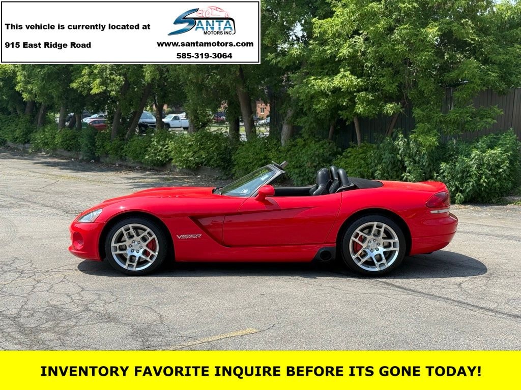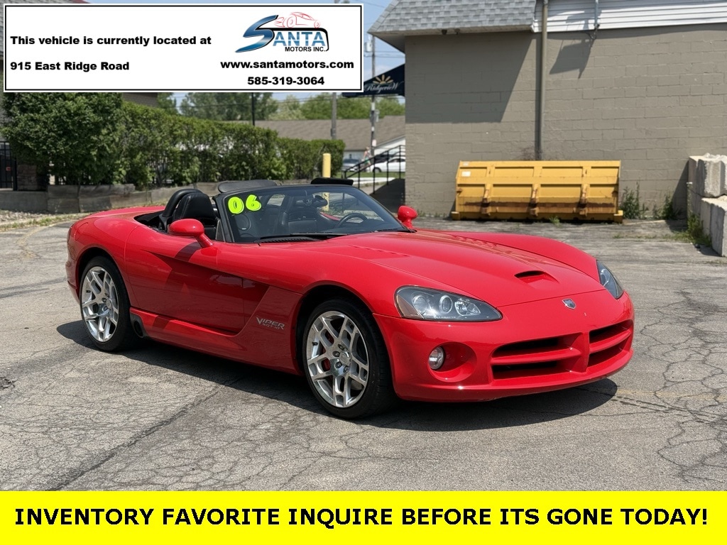 Santa Motors Certified Certified, 18 x 10" Front/19 x 13" Rear Aluminum (WP7) Wheels, 18 x 10" Front/19 x 13" Rear Aluminum Wheels, 4-Wheel Disc Brakes, 7 Speakers, ABS brakes, Adjustable pedals, Air Conditioning, Alloy wheels, AM/FM 6-Disc CD, AM/FM radio, Bumpers: body-color, CD player, Dual front impact airbags, Four wheel independent suspension, Front anti-roll bar, Front Bucket Seats, Front fog lights, Front reading lights, Glass rear window, High intensity discharge headlights: Xenon, Illuminated entry, Integrated roll-over protection, Leather Shift Knob, Leather steering wheel, Low tire pressure warning, Panic alarm, Passenger cancellable airbag, Power door mirrors, Power steering, Power windows, Preferred Suede & Leather Bucket Seats, Quick Order Package 21A, Radio data system, Rear anti-roll bar, Rear window defroster, Remote keyless entry, Security system, SIRIUS Satellite Radio, Tachometer, Tilt steering wheel, Variably intermittent wipers, Voltmeter. Certified. Viper Red Clearcoat/Black Soft Top 2006 Dodge Viper SRT10 RWD 6-Speed Manual 8.3L V10 SFI