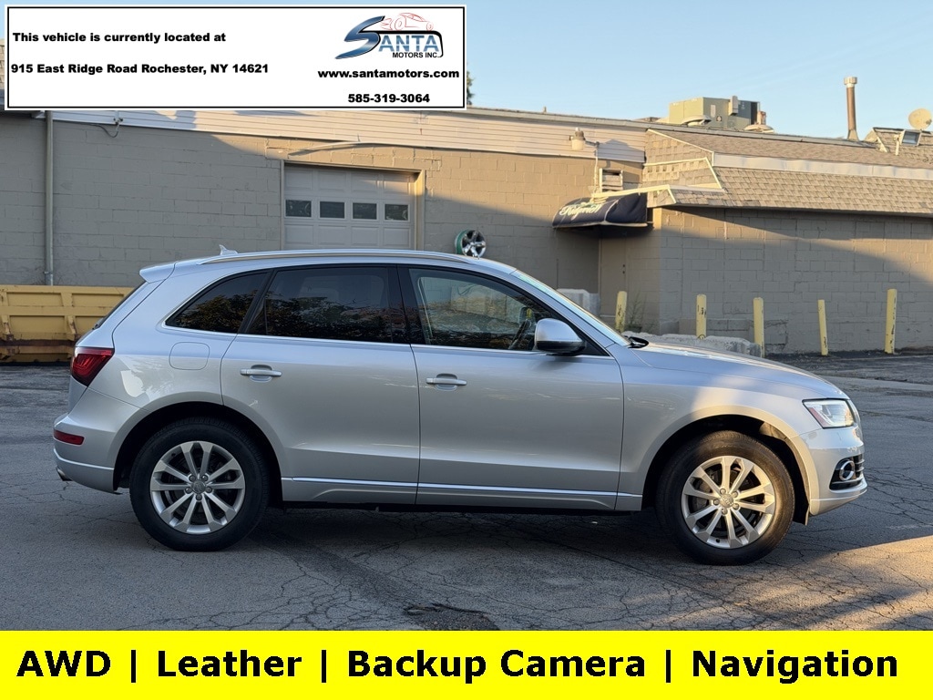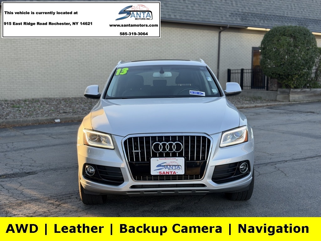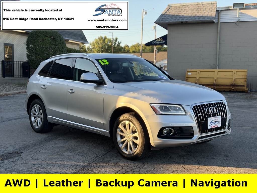 Black Leather, 10 Speakers, 2-Position Driver Side Memory, 3-Step Heated Front Seats, 3.76 Axle Ratio, 4-Wheel Disc Brakes, 8-Color Driver Information Display, 8.0J x 18" 5-Spoke-V-Design Wheels, ABS brakes, Air Conditioning, Alloy wheels, AM/FM radio: SiriusXM, Audi Advanced Key, Audi Connect w/Online Services, Audi Guard All-Weather Floor Mats & Trunk Liner, Audi MMI Navigation Plus Package, Audi Music Interface w/iPod Integration, Audi Parking System Plus w/Rear View Camera, Audi Xenon Plus Headlights, Auto-Dimming & Power-Folding Outside Mirrors, Auto-Dimming Interior Mirror w/Digital Compass, Automatic temperature control, Brake assist, Bumpers: body-color, CD player, Convenience Package, Deep Tinted 2-Panel Panorama Sunroof, Delay-off headlights, Driver door bin, Driver vanity mirror, Dual front impact airbags, Dual front side impact airbags, Electronic Stability Control, Four wheel independent suspension, Front anti-roll bar, Front Bucket Seats, Front Center Armrest, Front dual zone A/C, Front fog lights, Front reading lights, Genuine wood console insert, Genuine wood dashboard insert, Genuine wood door panel insert, Heated door mirrors, HomeLink Garage Door Opener, Illuminated entry, Leather Seating Surfaces, Leather Shift Knob, Leather steering wheel, Lighting Package, Low tire pressure warning, Occupant sensing airbag, Outside temperature display, Overhead airbag, Overhead console, Panic alarm, Passenger door bin, Passenger vanity mirror, Power door mirrors, Power driver seat, Power Front Bucket Seats, Power Opening/Closing Tailgate, Power passenger seat, Power steering, Power windows, Premium Plus Package, Preparation for Mobile Phone (Bluetooth), Radio data system, Radio: Audi MMI Plus System w/6.5" Color Screen, Radio: In-Dash Single CD/DVD Player & HD Radio, Rain sensing wipers, Rear air conditioning, Rear anti-roll bar, Rear fog lights, Rear reading lights, Rear seat center armrest, Rear window defroster, Rear window wiper, Remote keyless entry, Roof rack, Security system, Speed control, Speed-sensing steering, Speed-Sensitive Wipers, Split folding rear seat, Spoiler, Stainless Steel Trunk Edge Trim & Door Sills, Steering wheel mounted audio controls, Tachometer, Telescoping steering wheel, Tilt steering wheel, Traction control, Trip computer, Turn signal indicator mirrors, Variably intermittent wipers, Black Leather. Ice Silver Metallic 2013 Audi Q5 2.0T Premium Plus quattro quattro 8-Speed Automatic 2.0L I4 TFSI Direct Injection DOHC