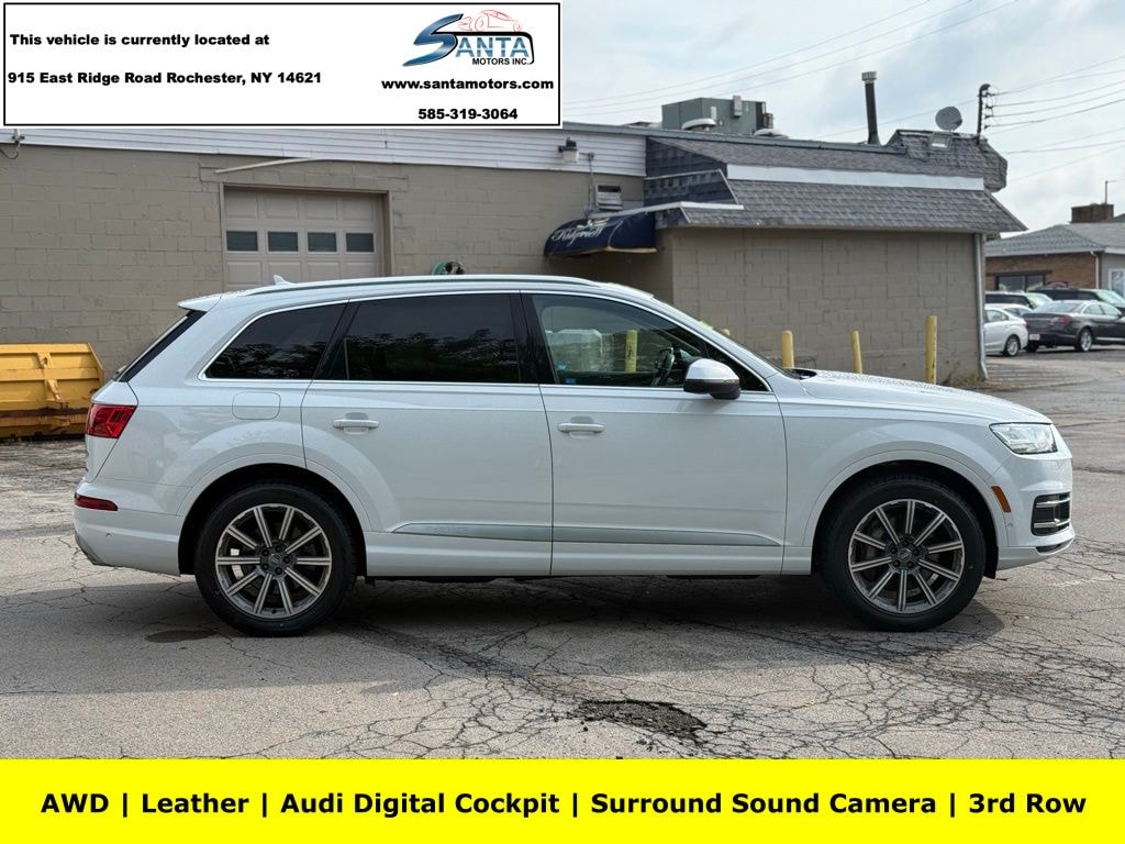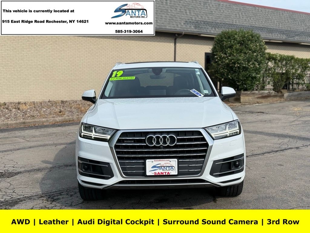 10 Speakers, 3.204 Axle Ratio, 3rd row seats: bench, 4-Wheel Disc Brakes, ABS brakes, Air Conditioning, Alloy wheels, AM/FM radio: SiriusXM, Audi smartphone interface (Apple CarPlay/Android Auto), Auto-dimming Rear-View mirror, Automatic temperature control, Brake assist, Bumpers: body-color, CD player, Compass, Delay-off headlights, Driver door bin, Driver vanity mirror, Driver's Seat Mounted Armrest, Dual front impact airbags, Dual front side impact airbags, Electronic Stability Control, Emergency communication system: Audi connect CARE, Exterior Parking Camera Rear, Four wheel independent suspension, Front anti-roll bar, Front Bucket Seats, Front dual zone A/C, Front fog lights, Front reading lights, Fully automatic headlights, Garage door transmitter: HomeLink, Heated door mirrors, Heated Front Bucket Seats, Heated front seats, High intensity discharge headlights: Xenon plus, Illuminated entry, Leather Seating Surfaces, Leather Shift Knob, Leather steering wheel, Low tire pressure warning, Memory seat, Navigation system: MMI Navigation plus, Occupant sensing airbag, Outside temperature display, Overhead airbag, Panic alarm, Passenger door bin, Passenger seat mounted armrest, Passenger vanity mirror, Power door mirrors, Power driver seat, Power Liftgate, Power moonroof, Power passenger seat, Power steering, Power windows, Radio data system, Radio: Audi MMI Navigation Plus, Rain sensing wipers, Rear air conditioning, Rear anti-roll bar, Rear fog lights, Rear reading lights, Rear seat center armrest, Rear window defroster, Rear window wiper, Remote keyless entry, Roof rack: rails only, Security system, Speed control, Speed-sensing steering, Split folding rear seat, Spoiler, Steering wheel memory, Steering wheel mounted audio controls, Tachometer, Telescoping steering wheel, Tilt steering wheel, Traction control, Trip computer, Turn signal indicator mirrors, Variably intermittent wipers, Wheels: 19" 5-V-Spoke Design, Wheels: 20" 10-Spoke-Star Design Bi-Color. White 2019 Audi Q7 55 Prestige quattro quattro 8-Speed Automatic with Tiptronic 3.0L TFSI V6 DOHC