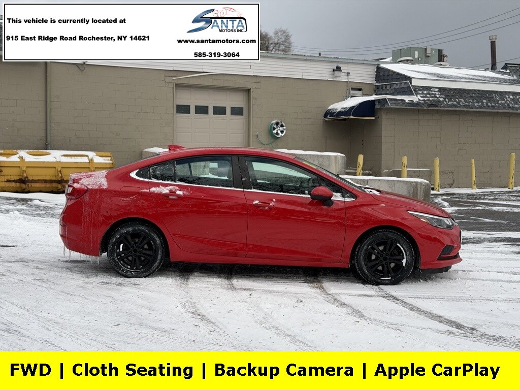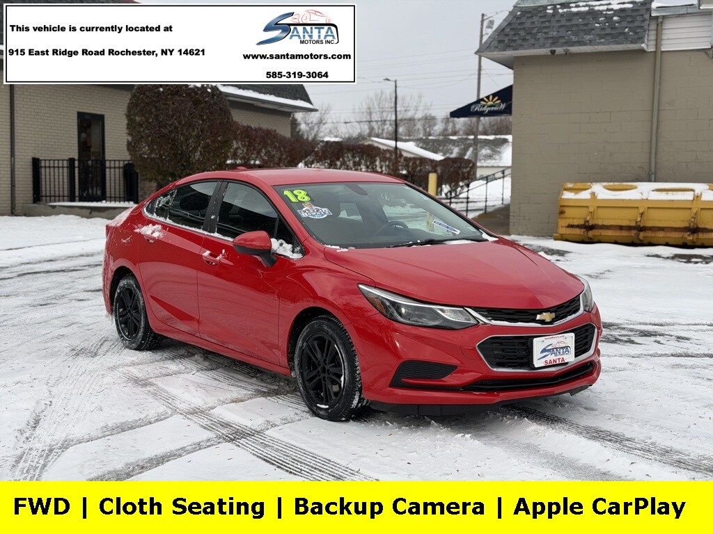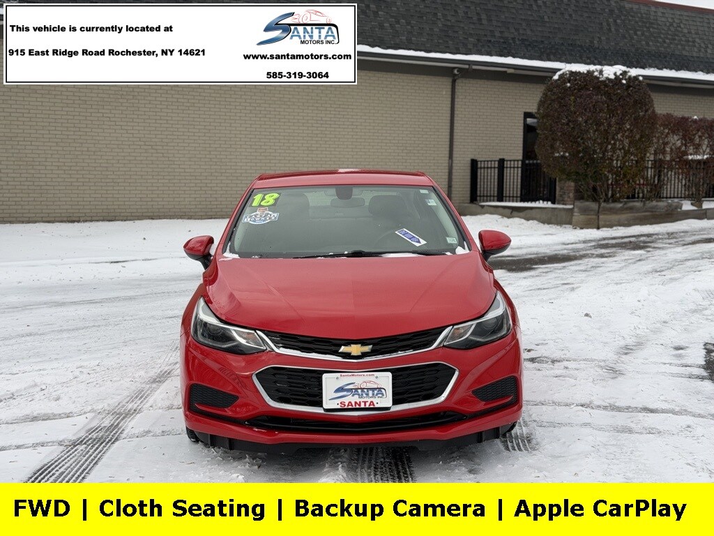 16" Aluminum Wheels, 4-Wheel Disc Brakes, 6 Speakers, 6-Speaker Audio System Feature, ABS brakes, Air Conditioning, Alloy wheels, AM/FM radio: SiriusXM, Apple CarPlay/Android Auto, Brake assist, Bumpers: body-color, Cloth Seat Trim, Compass, Delay-off headlights, Driver 6-Way Manual Seat Adjuster, Driver door bin, Driver vanity mirror, Dual front impact airbags, Dual front side impact airbags, Electronic Stability Control, Emergency communication system: OnStar Guidance, Exterior Parking Camera Rear, Front anti-roll bar, Front Bucket Seats, Front Center Armrest, Front Passenger 2-Way Manual Seat Adjuster, Front reading lights, Front wheel independent suspension, Fully automatic headlights, Heated door mirrors, Illuminated entry, Knee airbag, Low tire pressure warning, Occupant sensing airbag, Outside temperature display, Overhead airbag, Panic alarm, Passenger door bin, Passenger vanity mirror, Power door mirrors, Power steering, Power windows, Radio data system, Radio: AM/FM Chevrolet MyLink w/7" Touch-Screen, Rear seat center armrest, Rear side impact airbag, Rear window defroster, Remote keyless entry, Security system, SiriusXM Satellite Radio, Speed control, Split folding rear seat, Steering wheel mounted audio controls, Tachometer, Telescoping steering wheel, Tilt steering wheel, Traction control, Trip computer, Variably intermittent wipers, Voltmeter. Red 2018 Chevrolet Cruze LT FWD 6-Speed Automatic 1.4L 4-Cylinder Turbo DOHC CVVT