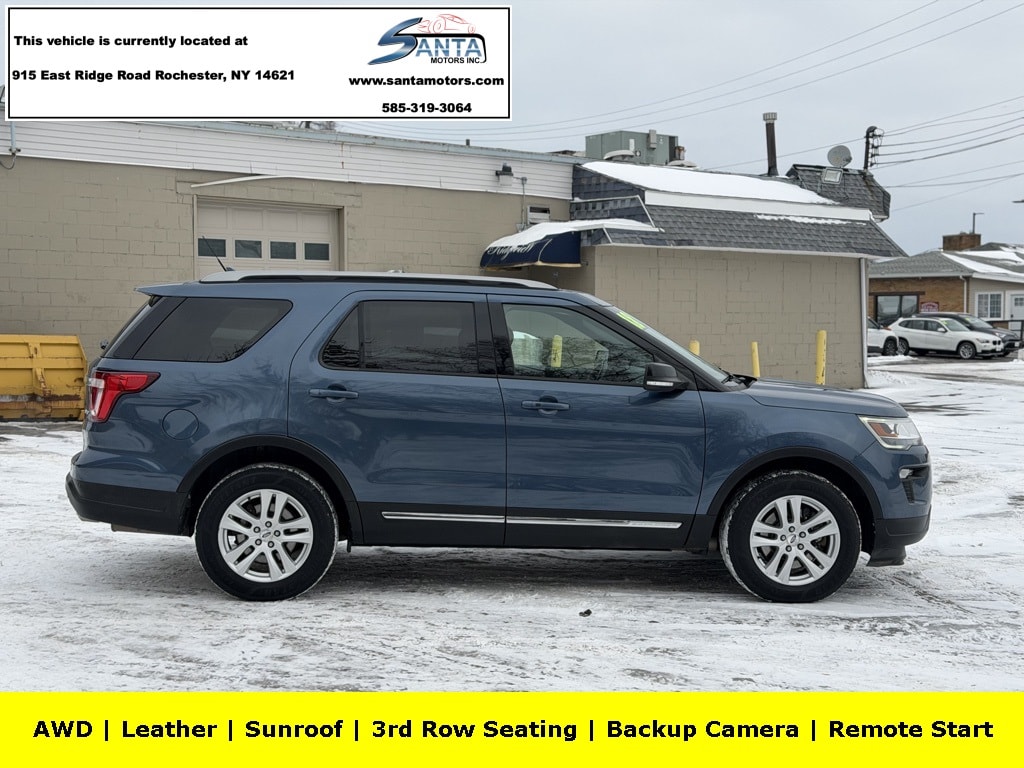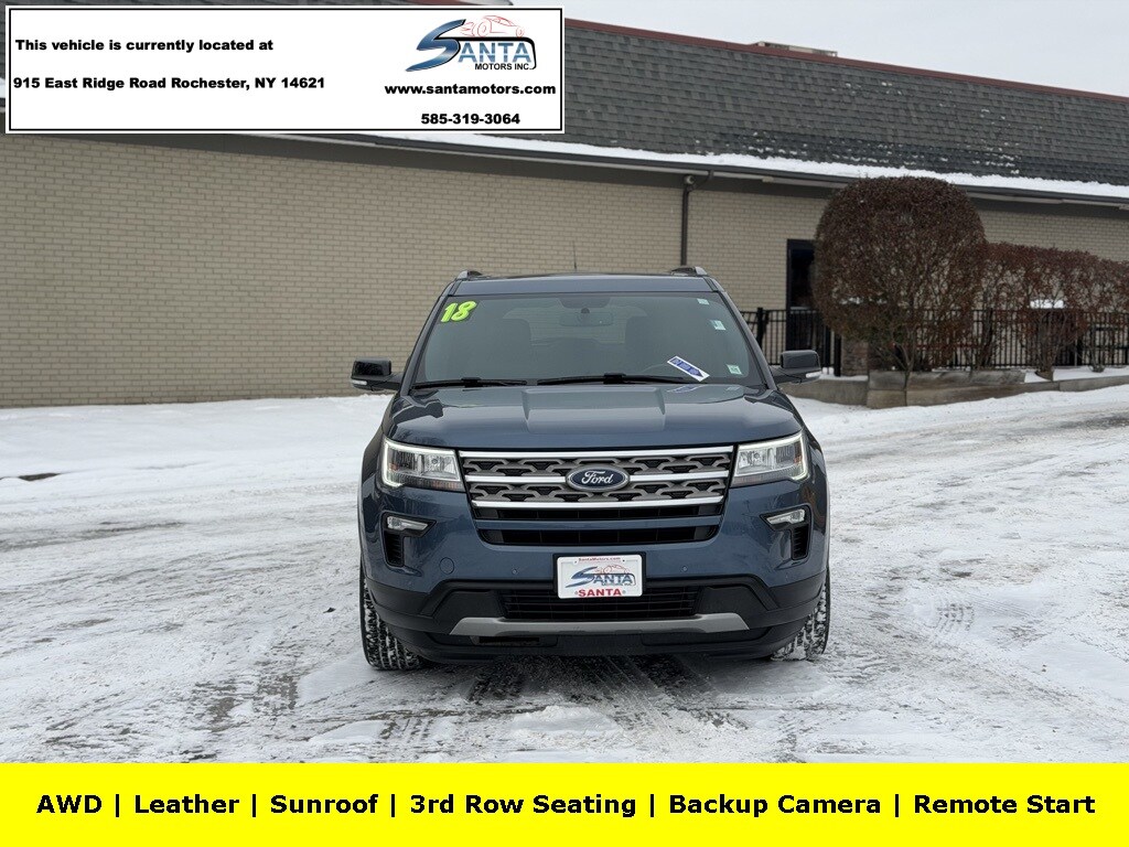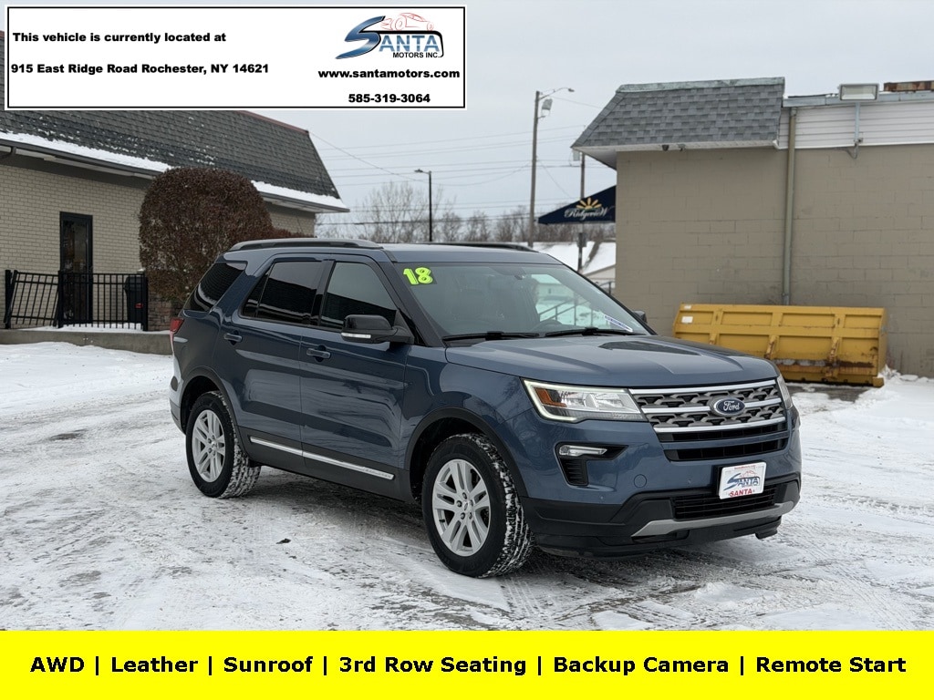 4WD, 3.65 Axle Ratio, 3rd row seats: split-bench, 4-Wheel Disc Brakes, 6 Speakers, ABS brakes, Air Conditioning, Alloy wheels, AM/FM radio: SiriusXM, AM/FM Stereo, Brake assist, Bumpers: body-color, Compass, Delay-off headlights, Driver door bin, Driver vanity mirror, Dual front impact airbags, Dual front side impact airbags, Electronic Stability Control, Emergency communication system: 911 Assist, Exterior Parking Camera Rear, Four wheel independent suspension, Front anti-roll bar, Front Bucket Seats, Front Center Armrest, Front reading lights, Fully automatic headlights, Heated door mirrors, Illuminated entry, Knee airbag, Leather steering wheel, Low tire pressure warning, Occupant sensing airbag, Outside temperature display, Overhead airbag, Overhead console, Panic alarm, Passenger door bin, Passenger vanity mirror, Power door mirrors, Power driver seat, Power passenger seat, Power steering, Power windows, Rear air conditioning, Rear anti-roll bar, Rear Parking Sensors, Rear reading lights, Rear seat center armrest, Rear window defroster, Rear window wiper, Remote keyless entry, Roof rack: rails only, Security system, Speed control, Speed-sensing steering, Speed-Sensitive Wipers, Split folding rear seat, Spoiler, Steering wheel mounted audio controls, SYNC Communication & Entertainment System, Tachometer, Telescoping steering wheel, Tilt steering wheel, Traction control, Trip computer, Variably intermittent wipers, Wheels: 18" 5-Split-Spoke Sparkle Silver-Painted, 4WD. Blue 2018 Ford Explorer XLT 4WD 6-Speed Automatic with Select-Shift 3.5L 6-Cylinder SMPI DOHC