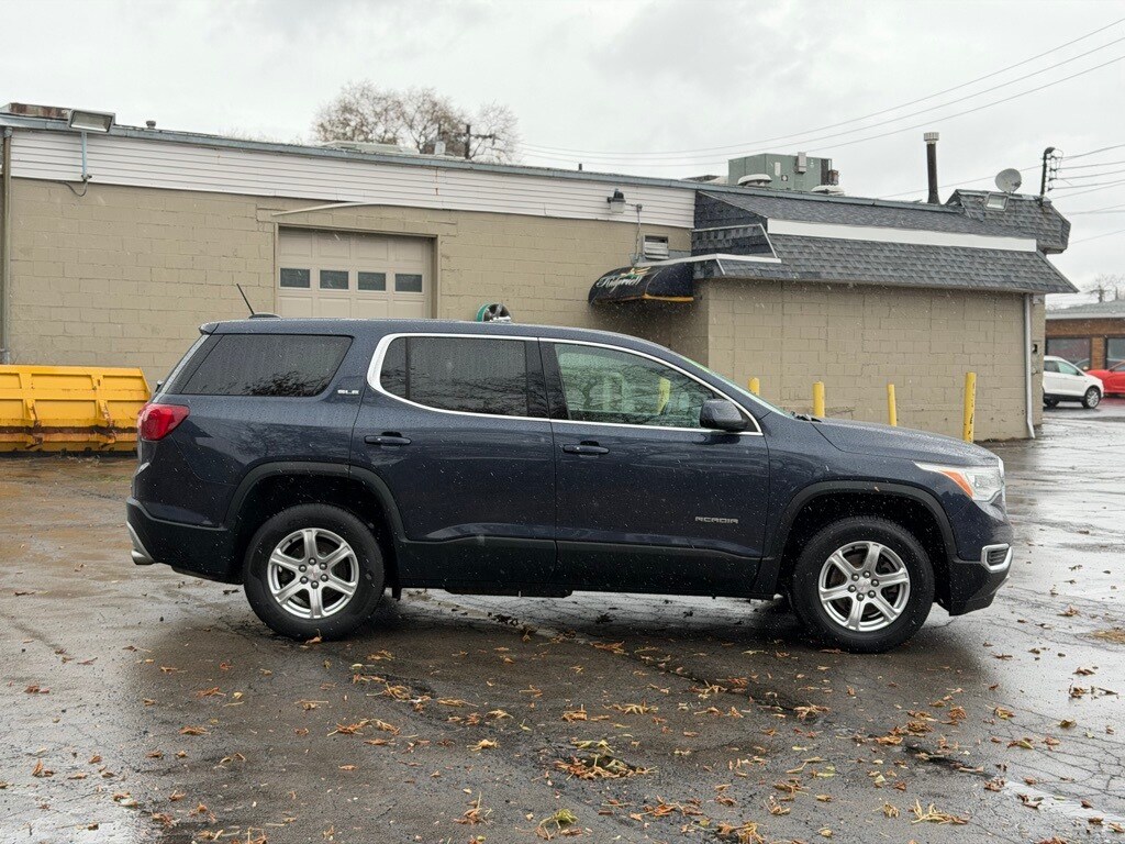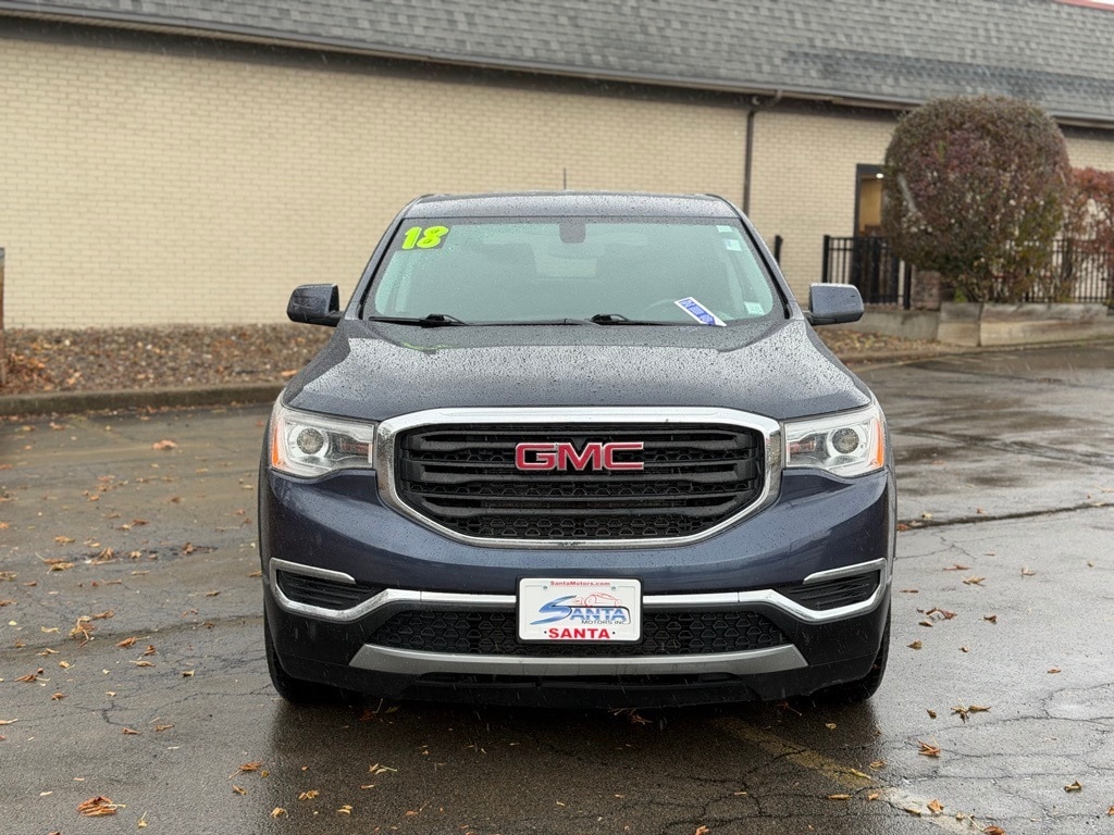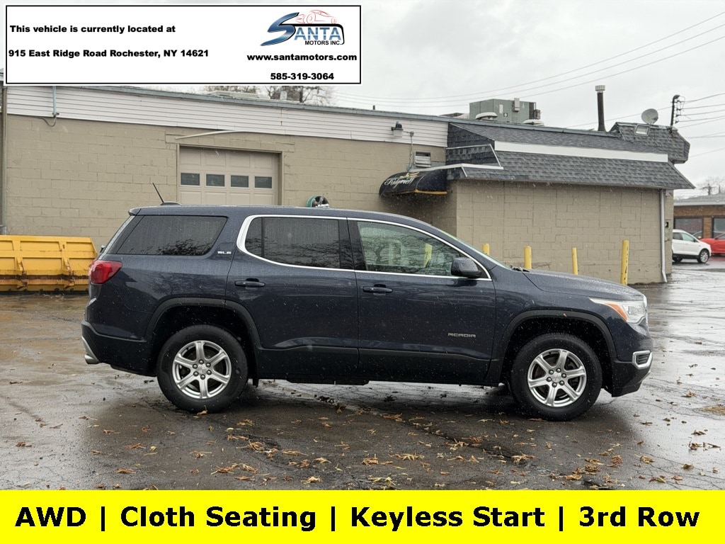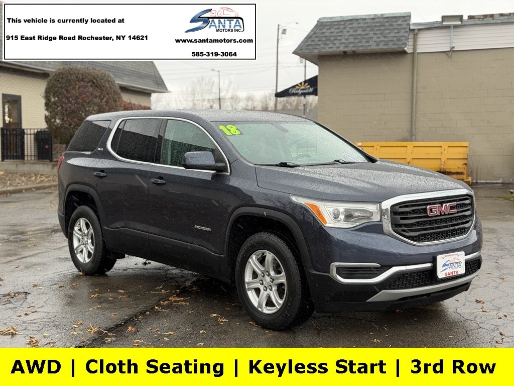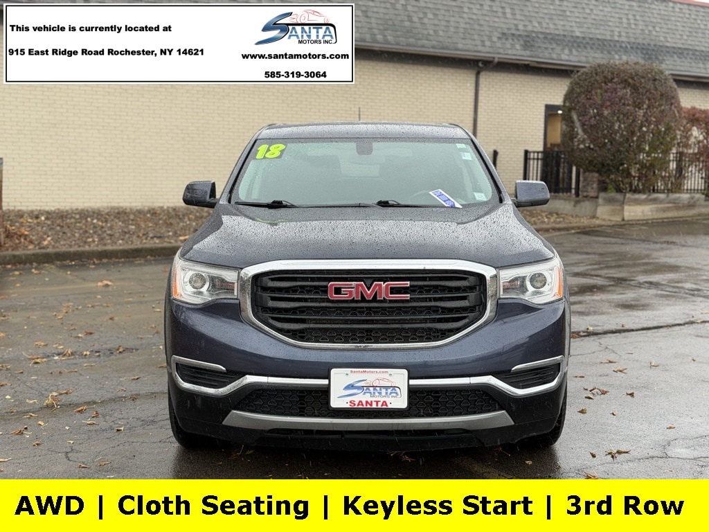 AWD, Jet Black Cloth, 155 Amp Alternator, 17" x 7.5" Aluminum Wheels, 3.16 Axle Ratio, 3.87 Axle Ratio, 3rd Row All-Weather Floor Liner (LPO), 3rd row seats: split-bench, 4-Wheel Disc Brakes, 6 Speakers, 7-Passenger (2-3-2 Seating Configuration), ABS brakes, Air Conditioning, All-Weather Floor Liner (LPO), Alloy wheels, AM/FM radio: SiriusXM, Apple CarPlay/Android Auto, Automatic temperature control, Brake assist, Bumpers: body-color, Compass, Delay-off headlights, Driver door bin, Driver vanity mirror, Dual front impact airbags, Dual front side impact airbags, Electronic Stability Control, Emergency communication system: OnStar and GMC connected services capable, Exterior Parking Camera Rear, Floor Liner Package (LPO), Four wheel independent suspension, Front anti-roll bar, Front Bucket Seats, Front Center Armrest, Front dual zone A/C, Front License Plate Bracket, Front reading lights, Fully automatic headlights, Heated door mirrors, Illuminated entry, Knee airbag, Low tire pressure warning, Occupant sensing airbag, Outside temperature display, Overhead airbag, Overhead console, Panic alarm, Passenger door bin, Passenger vanity mirror, Power door mirrors, Power steering, Power windows, Preferred Equipment Group 3SA, Premium audio system: GMC Infotainment System, Premium Cloth Seat Trim, Radio data system, Radio: AM/FM w/7" Diagonal Color Touch Screen, Rear air conditioning, Rear anti-roll bar, Rear reading lights, Rear seat center armrest, Rear window defroster, Rear window wiper, Remote keyless entry, Security system, SiriusXM Satellite Radio, Speed control, Speed-sensing steering, Split folding rear seat, Spoiler, Steering wheel mounted audio controls, Stop-Start Engine Control System, Tachometer, Telescoping steering wheel, Tilt steering wheel, Traction control, Trip computer, Variably intermittent wipers, Voltmeter, AWD, Jet Black Cloth. Blue Steel Metallic 2018 GMC Acadia SLE-1 AWD 6-Speed Automatic 3.6L V6 SIDI DOHC VVT