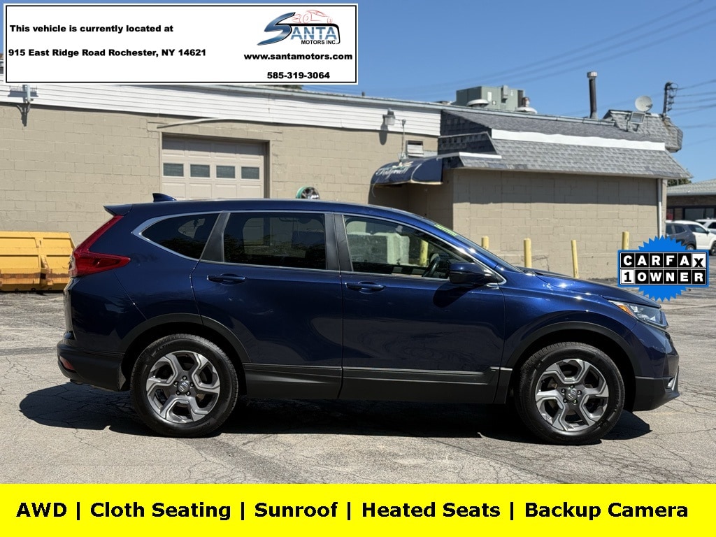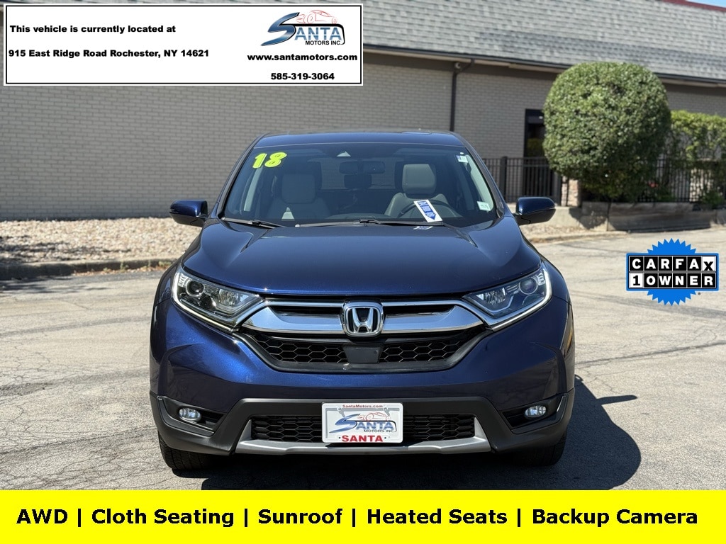 AWD, 18" Alloy Wheels, 4-Wheel Disc Brakes, 5.64 Axle Ratio, 8 Speakers, ABS brakes, Air Conditioning, Alloy wheels, AM/FM radio: SiriusXM, Apple CarPlay/Android Auto, Auto High-beam Headlights, Auto-dimming Rear-View mirror, Automatic temperature control, Blind Spot Information (BSI) System warning, Brake assist, Bumpers: body-color, Compass, Delay-off headlights, Driver door bin, Driver vanity mirror, Dual front impact airbags, Dual front side impact airbags, Electronic Stability Control, Exterior Parking Camera Rear, Four wheel independent suspension, Front anti-roll bar, Front Bucket Seats, Front Center Armrest, Front dual zone A/C, Front fog lights, Front reading lights, Fully automatic headlights, Garage door transmitter: HomeLink, Heated door mirrors, Heated Front Bucket Seats, Heated front seats, Illuminated entry, Leather Seat Trim, Leather Shift Knob, Low tire pressure warning, Memory seat, Occupant sensing airbag, Outside temperature display, Overhead airbag, Overhead console, Panic alarm, Passenger door bin, Passenger vanity mirror, Power door mirrors, Power driver seat, Power Liftgate, Power moonroof, Power passenger seat, Power steering, Power windows, Radio data system, Radio: AM/FM/SiriusXM Audio System, Rear anti-roll bar, Rear seat center armrest, Rear window defroster, Rear window wiper, Remote keyless entry, Security system, Speed control, Speed-sensing steering, Speed-Sensitive Wipers, Split folding rear seat, Spoiler, Steering wheel mounted audio controls, Tachometer, Telescoping steering wheel, Tilt steering wheel, Traction control, Trip computer, Turn signal indicator mirrors, Variably intermittent wipers, AWD. Blue 2018 Honda CR-V EX-L AWD CVT 1.5L I4 DOHC 16V