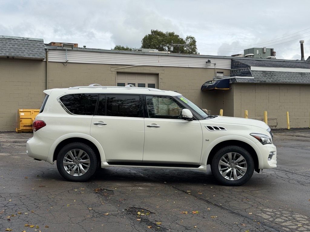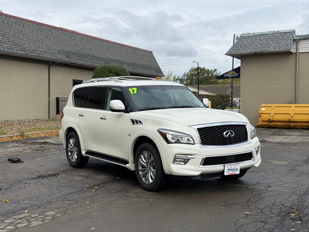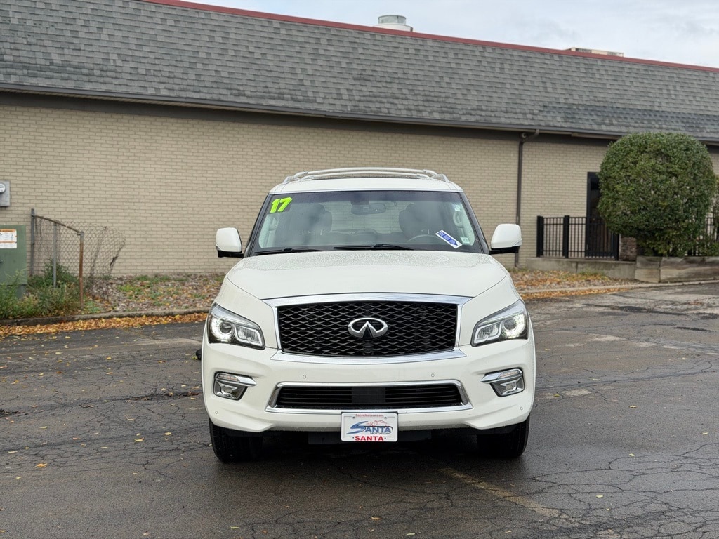 13 Speakers, 2.94 Axle Ratio, 3rd row seats: split-bench, 4-Wheel Disc Brakes, ABS brakes, Air Conditioning, Alloy wheels, AM/FM radio: SiriusXM, Anti-whiplash front head restraints, Auto High-beam Headlights, Auto tilt-away steering wheel, Auto-dimming door mirrors, Auto-dimming Rear-View mirror, Auto-leveling suspension, Automatic temperature control, Bose Premium Sound System, Brake assist, Bumpers: body-color, CD player, Delay-off headlights, Driver door bin, Driver vanity mirror, Dual front impact airbags, Dual front side impact airbags, Electronic Stability Control, Emergency communication system: INFINITI Connection, Four wheel independent suspension, Front anti-roll bar, Front Bucket Seats, Front Center Armrest, Front dual zone A/C, Front fog lights, Front reading lights, Fully automatic headlights, Garage door transmitter: HomeLink, Genuine wood console insert, Genuine wood dashboard insert, Genuine wood door panel insert, Heated door mirrors, Heated Front Bucket Seats, Heated front seats, Heated steering wheel, Illuminated entry, Leather Shift Knob, Leather steering wheel, Leather-Appointed Seats w/Mocha Burl Trim, Low tire pressure warning, Memory seat, Navigation System, Occupant sensing airbag, Outside temperature display, Overhead airbag, Overhead console, Panic alarm, Passenger door bin, Passenger vanity mirror, Power door mirrors, Power driver seat, Power Liftgate, Power moonroof, Power passenger seat, Power steering, Power windows, Radio data system, Rain sensing wipers, Rear air conditioning, Rear anti-roll bar, Rear audio controls, Rear reading lights, Rear seat center armrest, Rear window defroster, Rear window wiper, Reclining 3rd row seat, Remote keyless entry, Roof rack: rails only, Security system, Speed control, Speed-sensing steering, Split folding rear seat, Spoiler, Steering wheel memory, Steering wheel mounted audio controls, Tachometer, Telescoping steering wheel, Tilt steering wheel, Traction control, Trip computer, Turn signal indicator mirrors, Variably intermittent wipers, Voltmeter, Wheels: 20" x 8.0" Split 6-Spoke Aluminum-Alloy. Majestic 2017 INFINITI QX80 4WD 7-Speed Automatic 5.6L V8