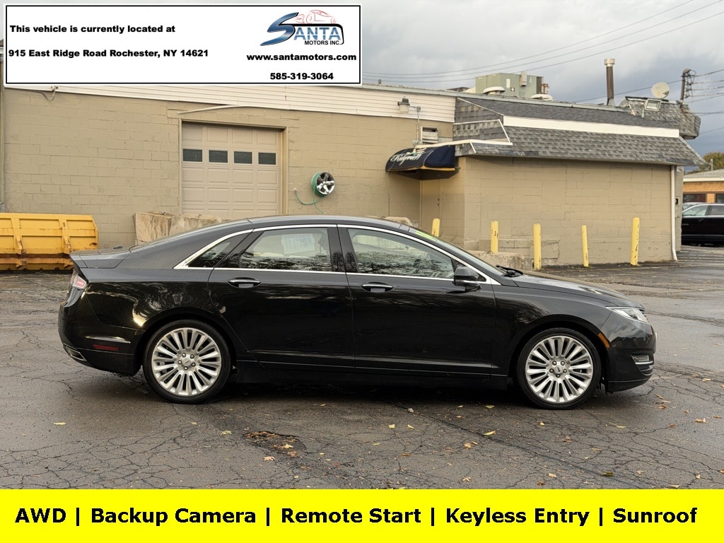 AWD, 11 Speakers, 18" Premium Painted Aluminum Wheels, 4-Wheel Disc Brakes, ABS brakes, Adaptive suspension, Air Conditioning, Alloy wheels, AM/FM radio: SiriusXM, Auto-dimming Rear-View mirror, Automatic temperature control, Brake assist, Bumpers: body-color, CD player, Compass, Delay-off headlights, Driver door bin, Driver vanity mirror, Dual front impact airbags, Dual front side impact airbags, Electronic Stability Control, Four wheel independent suspension, Front anti-roll bar, Front Bucket Seats, Front Center Armrest, Front dual zone A/C, Front reading lights, Fully automatic headlights, Garage door transmitter, Genuine wood dashboard insert, Genuine wood door panel insert, Heated door mirrors, Heated front seats, Illuminated entry, Knee airbag, Leather steering wheel, Low tire pressure warning, Memory seat, Occupant sensing airbag, Outside temperature display, Overhead airbag, Overhead console, Panic alarm, Passenger door bin, Passenger vanity mirror, Power door mirrors, Power driver seat, Power passenger seat, Power steering, Power windows, Premium Leather-Trimmed Non-Perforated Buckets, Radio data system, Radio: Lincoln Premium Sound System w/SingleCD/MP3, Rear anti-roll bar, Rear reading lights, Rear seat center armrest, Rear window defroster, Remote keyless entry, Security system, Speed control, Speed-sensing steering, Speed-Sensitive Wipers, Split folding rear seat, Steering wheel mounted audio controls, SYNC Communications & Entertainment System, Tachometer, Telescoping steering wheel, Tilt steering wheel, Traction control, Trip computer, Turn signal indicator mirrors, Variably intermittent wipers, AWD. Black 2014 Lincoln MKZ AWD 6-Speed Automatic with Select-Shift 3.7L V6 Ti-VCT 24V