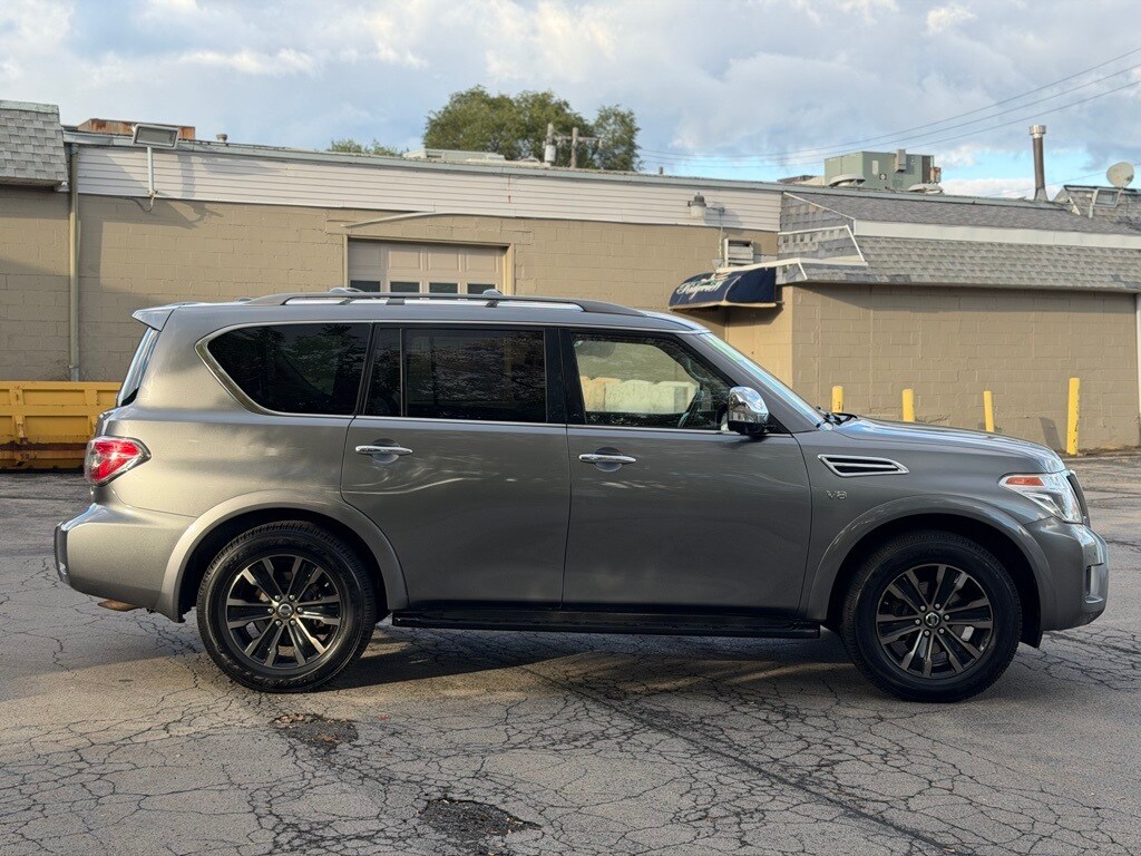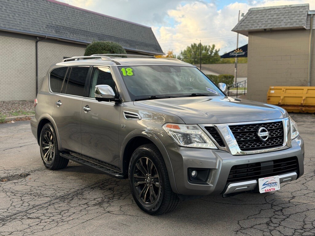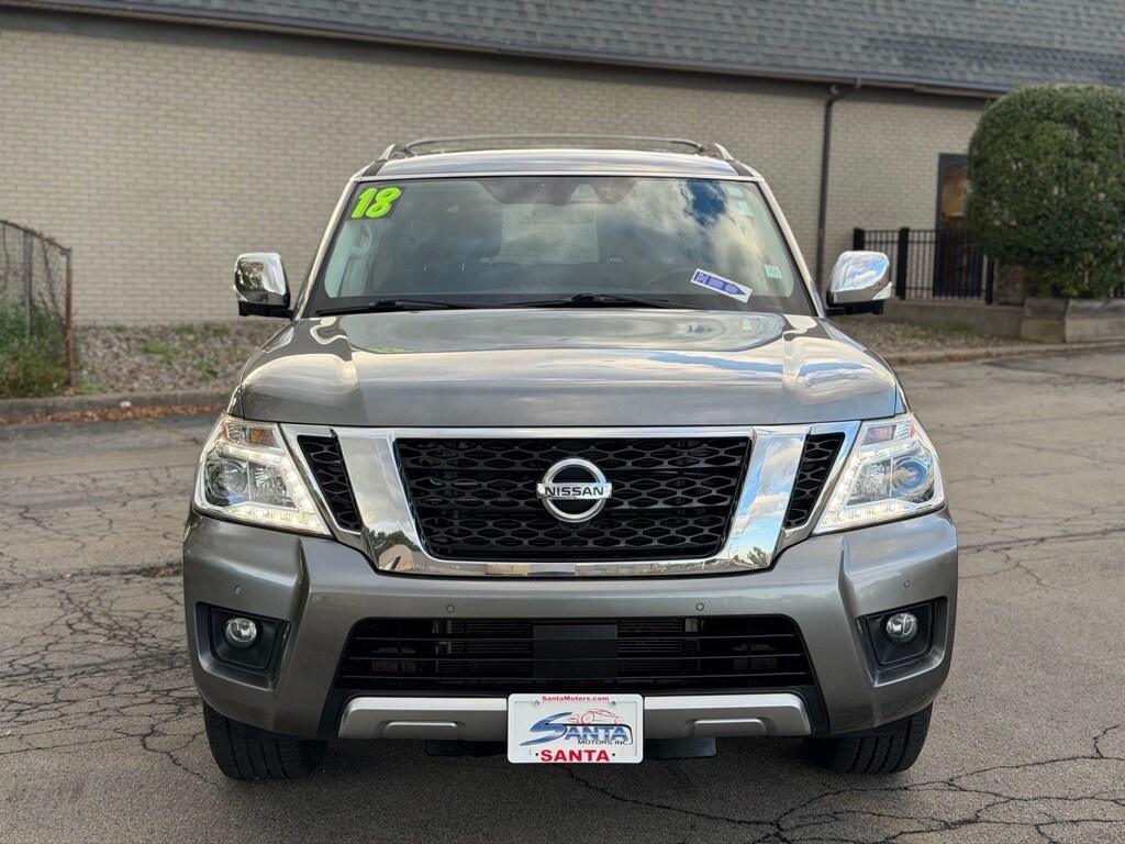 4WD, 13 Speakers, 2.937 Axle Ratio, 3rd row seats: split-bench, 4-Wheel Disc Brakes, A/V remote, ABS brakes, Air Conditioning, Alloy wheels, AM/FM radio: SiriusXM, Anti-whiplash front head restraints, Auto tilt-away steering wheel, Auto-dimming door mirrors, Auto-dimming Rear-View mirror, Auto-leveling suspension, Automatic temperature control, Brake assist, Bumpers: body-color, CD player, Delay-off headlights, Driver door bin, Driver vanity mirror, Dual front impact airbags, Dual front side impact airbags, Electronic Stability Control, Emergency communication system: NissanConnect Services, Four wheel independent suspension, Front anti-roll bar, Front Bucket Seats, Front Center Armrest, Front dual zone A/C, Front fog lights, Front reading lights, Fully automatic headlights, Garage door transmitter: HomeLink, Headphones, Heated & Cooled Front Bucket Seats w/Driver Memory, Heated door mirrors, Heated front seats, Heated rear seats, Heated steering wheel, Illuminated entry, Lane Departure Warning System, Leather Shift Knob, Leather-Appointed Seat Trim, Low tire pressure warning, Memory seat, Navigation System, Occupant sensing airbag, Outside temperature display, Overhead airbag, Overhead console, Panic alarm, Passenger door bin, Passenger vanity mirror, Power door mirrors, Power driver seat, Power Liftgate, Power moonroof, Power passenger seat, Power steering, Power windows, Radio data system, Radio: Bose AM/FM/SXM/CD/MP3/HD Radio, Rain sensing wipers, Rear air conditioning, Rear anti-roll bar, Rear reading lights, Rear seat center armrest, Rear window defroster, Rear window wiper, Reclining 3rd row seat, Remote keyless entry, Roof rack: rails only, Security system, Speed control, Speed-sensing steering, Speed-Sensitive Wipers, Split folding rear seat, Spoiler, Steering wheel memory, Steering wheel mounted audio controls, Tachometer, Telescoping steering wheel, Tilt steering wheel, Traction control, Trip computer, Turn signal indicator mirrors, Variably intermittent wipers, Ventilated front seats, Voltmeter, Wheels: 20" Machine-Faced Chrome w/Tinted CC, 4WD. Gun Metallic 2018 Nissan Armada Platinum 4WD 7-Speed Automatic 5.6L V8 DOHC 32V Endurance