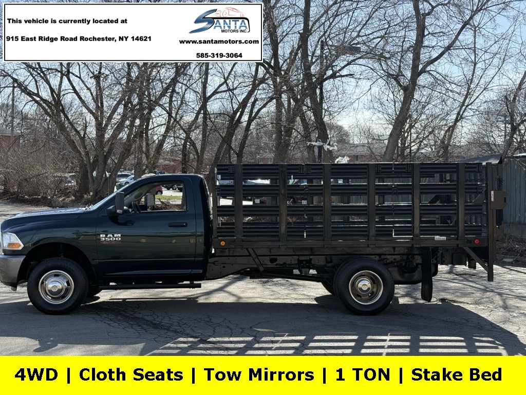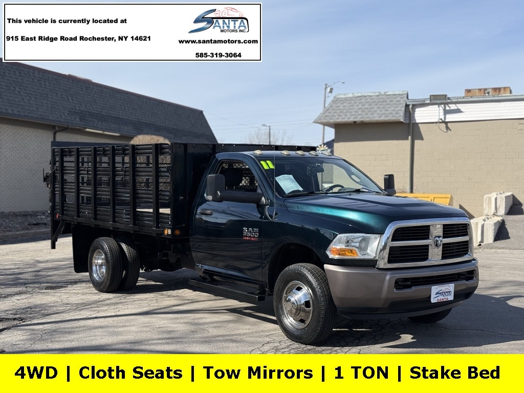 17" x 6" Argent Steel Wheels, 2 Speakers, 4-Wheel Disc Brakes, 40/20/40 Split Bench Seat, ABS brakes, AM/FM radio, Black Exterior Mirrors, CD player, Center Hub, Delay-off headlights, Driver door bin, Dual front impact airbags, Dual rear wheels, Front anti-roll bar, Front Center Armrest w/Storage, Fully automatic headlights, General Brand Tires, HD Vinyl 40/20/40 Split Bench Seat, Mini Floor Console, Passenger cancellable airbag, Passenger door bin, Passenger vanity mirror, Power steering, Radio: Media Center 130 CD/MP3, Rear anti-roll bar, Tachometer, Tilt steering wheel, Variably intermittent wipers, Voltmeter. Hunter Green Pearlcoat 2011 Ram 3500HD ST 4WD 5-Speed Automatic HEMI 5.7L V8 VVT